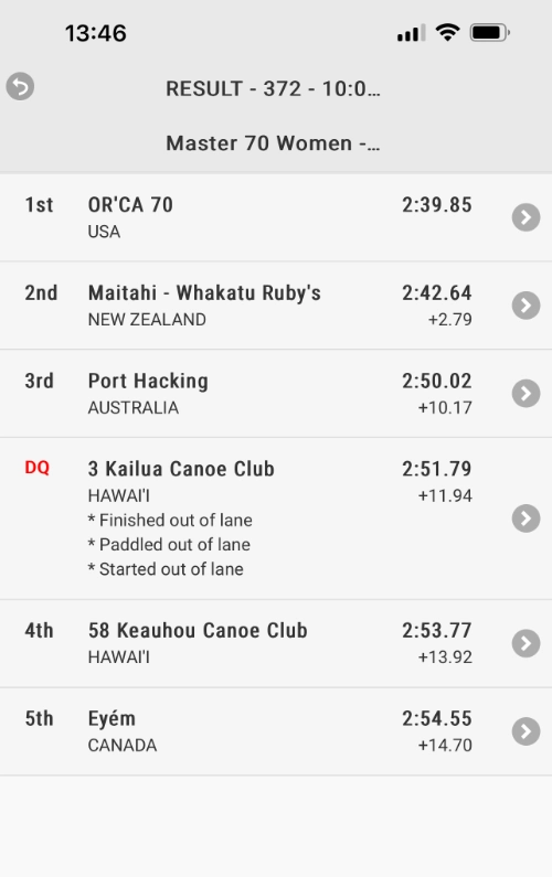 Loading into the waka was again a bit troublesome even though they were able to turn the waka sideways for the first time. I caught my leg under the seat and am now looking for the arnica. We were one of the first waka to load out and had a relaxed run up to the end. Penny got us beautifully positioned to make our approach for the white flag to the start line. There was a bit of raruraru in the lanes next to us. Our crew has done a fantastic job of keeping our heads in our waka right from warm up to finish. There is a lot of chatter all around us but we don’t get pulled into it.