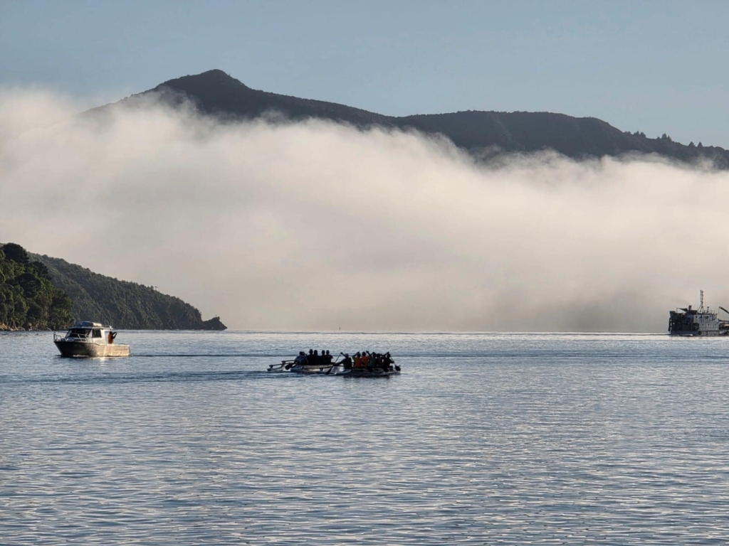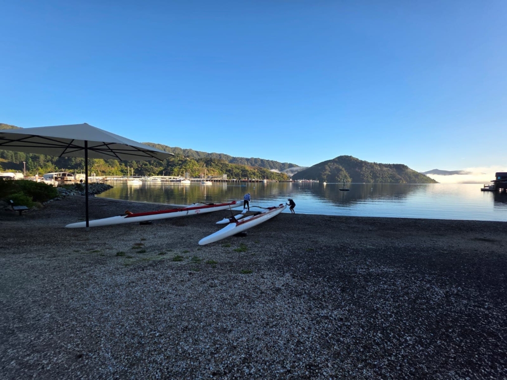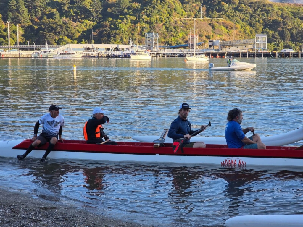 If you like your racing to offer conditions that allow you to concentrate on technique then the Portage weekend was for you. There was barely a breath of wind or a bump on the water on a warm, blue sky day. Jeff Neilson did the early hard yards before he had even picked up his steering hoe, towing the four Maitahi waka over the hills to Picton.