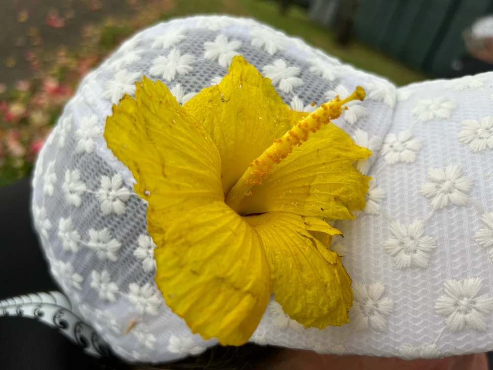I caught up with my Hawaiian friend Emily who had prepared Ma’o hau hele (yellow hibiscus, the state flower) for Rubys crew. She even had the toothpicks through the centre so we could fix them to our hats (or behind my glasses).